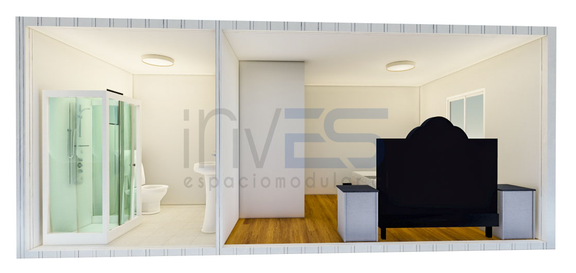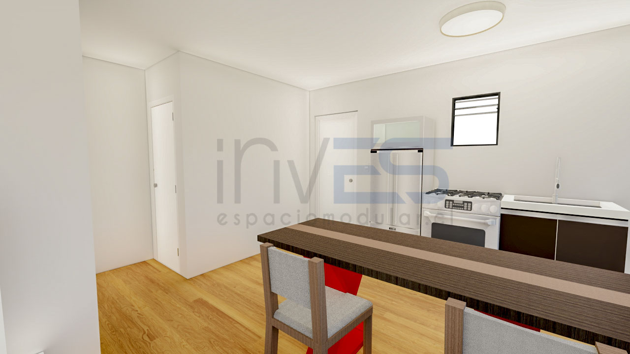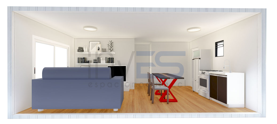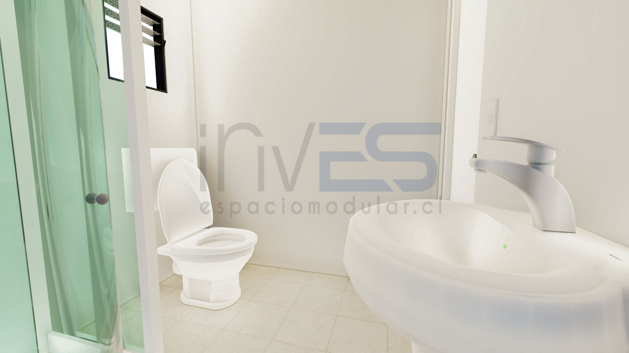 INCLUYE 2 modulos de 6,00×3,00m. Baño completo, wc, lavamanos, ducha. Cocina con lavaplatos y su mueble de base. todas las ventanas son de 1.00 x 1.00 cm . modelo de referencia.