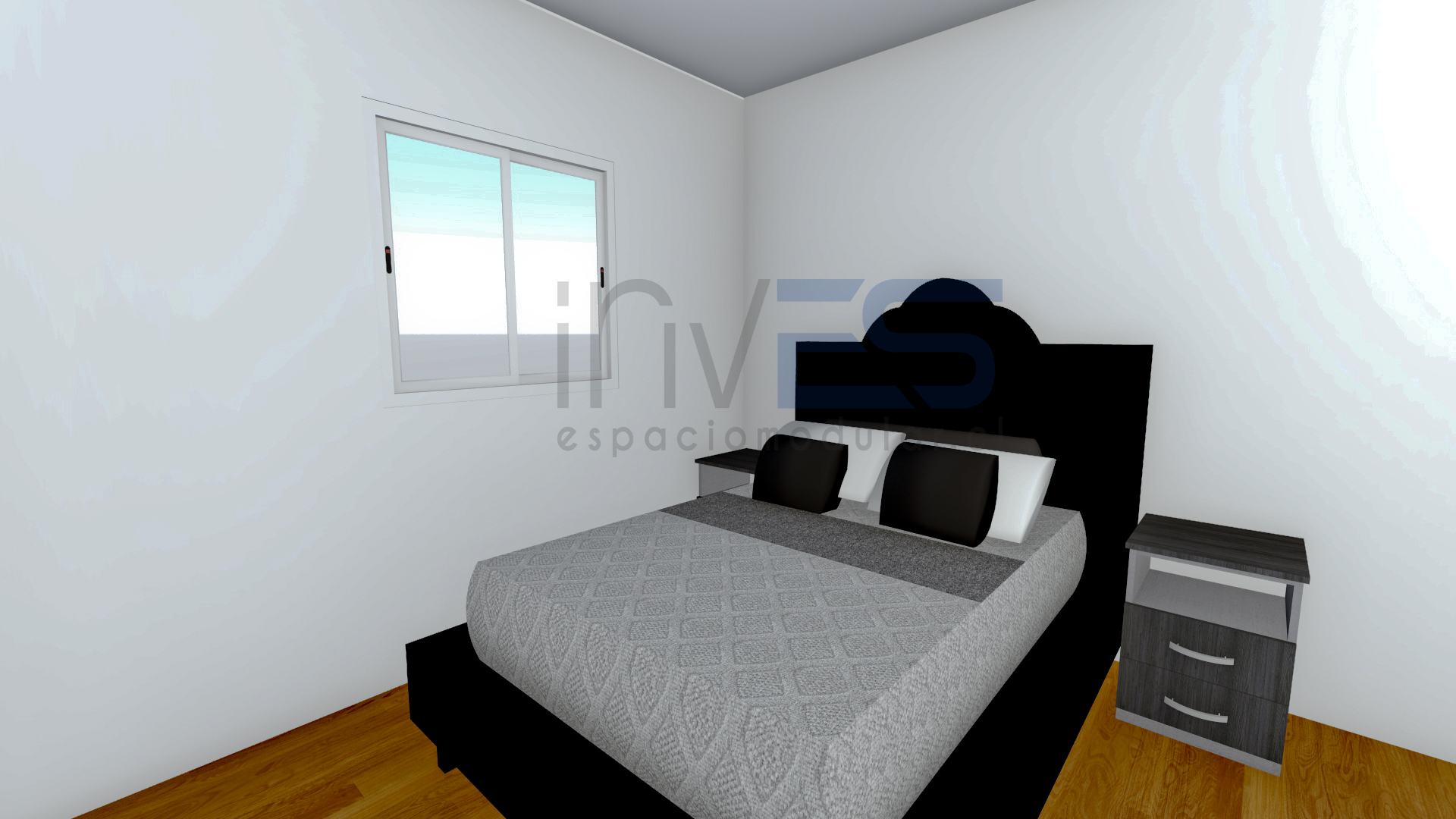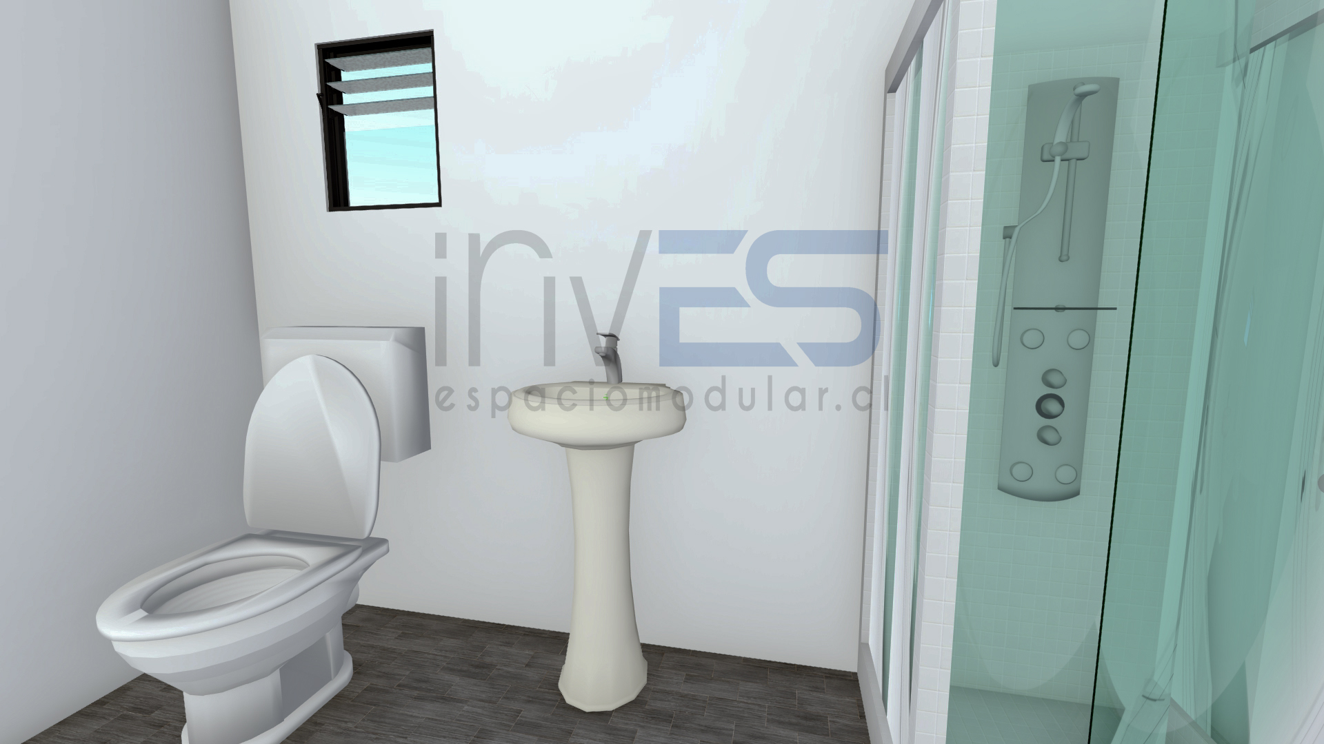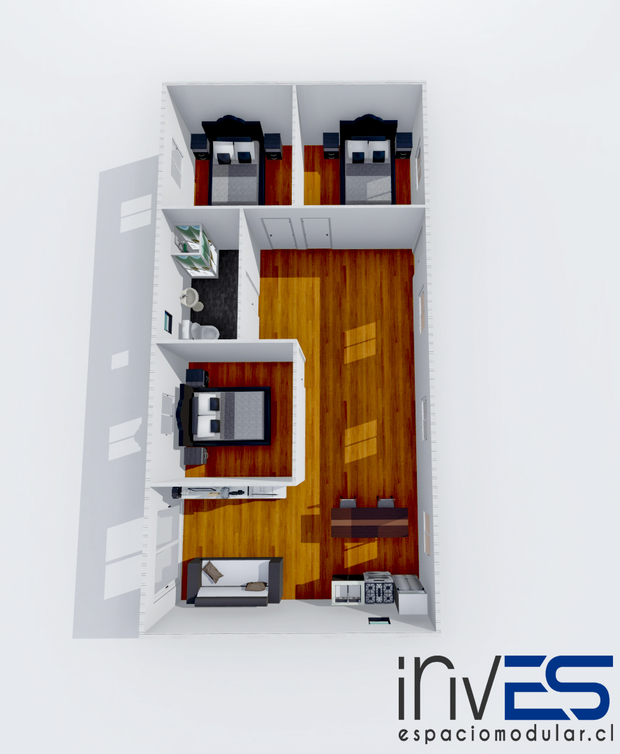 INCLUYE 4 módulos de 6,00×3,00m. Baños completos, wc, lavamanos, ducha. Cocina con lavaplatos y su mueble de base. todas las ventanas son de 1.00 x 1.00 cm . modelo de referencia.